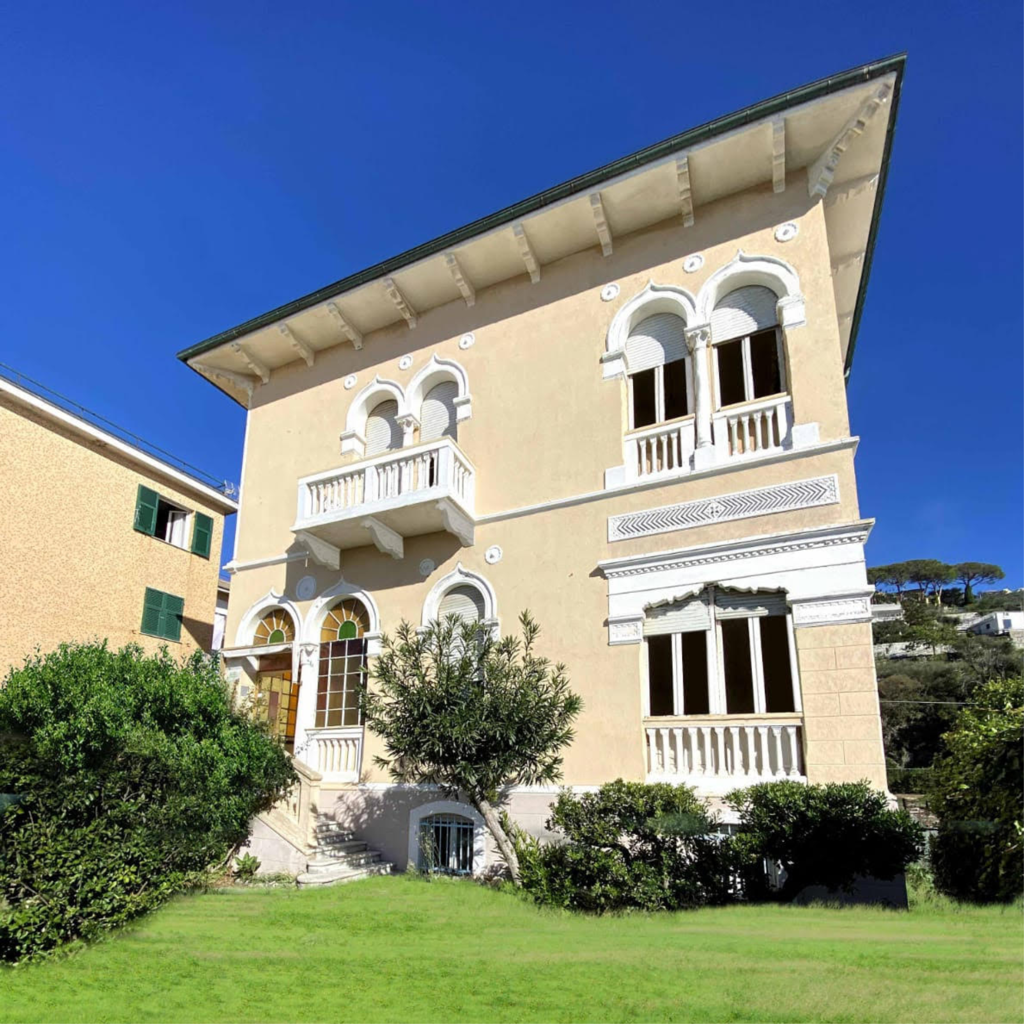 collegabili al piano sovrastante della villa. Il primo piano/ rialzato, accessibile direttamente dal giardino antistante tramite una scala scenografica e molto elegante, gode di una loggia signorile che anticipa lo stile presente all’interno dei locali. Il piano, con esposizione su tutti i lati, si presta ad essere adibito a zona giorno, cucina, una camera da letto ed un bagno. Una scala in marmo, ottimamente conservata, collega il primo piano con il secondo adibito a zona notte e composto da ben quattro grandi camere da letto con almeno altri due bagni completi. A completamento della struttura, non meno importanti vi sono caratteristici balconcini, sempre in stile dell’epoca. Ulteriori peculiarità che rendono questa villa davvero un bene appetibile sono i soffitti alti, tipici dell’epoca, e le ampie finestre che impreziosiscono la villa e ne aumentano il fascino creando una veduta sul mare davvero indimenticabile. La superficie commerciale ponderata tra unità abitativa+ locali cantina seminterrato + giardino + posti auto è di ca. 425 mq. Il terreno di proprietà che circonda l’immobile è dotato di due accessi carrabili: il progetto prevederà di utilizzare gli spazi esterni per adibirli a posti auto, piscina e giardini. L’edificio sarà oggetto di cambio destinazione d’uso e sarà accatastato adeguatamente ad uso abitativo come villa unifamiliare. L’invidiabile esposizione vista mare è un must del deal; in particolare dal secondo piano il panorama spazierà su tutto il golfo e sul giardino che circonda la Villa.